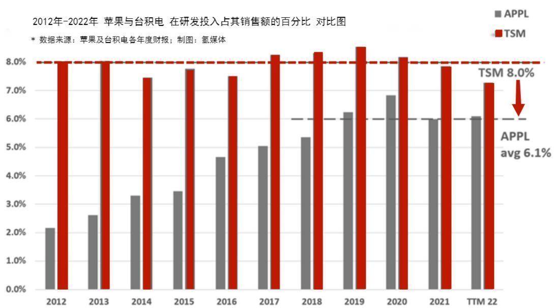 上图显示了苹果与台积电在过去10年的研发投入占他们总销售额的百分比,要知道,苹果和台积电都是全球科技巨头,他们的销售收入是惊人的以千亿美元做基数的数量级。