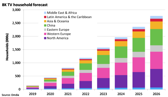 Omdia做出预测,去年全球拥有8K电视的用户可能在80万户左右,今年有望增加到118万户,明年150万户,每年以35万~40万户的数量在增加。即便如此,到2026年全球8K电视用户可能也只有270万户左右,市场份额不足0.2%。而且,这还是较为乐观地预测,如果全球经济持续恶化,市面上又缺乏相应的8K影视内容,那实际数值可能会比预计的更低。