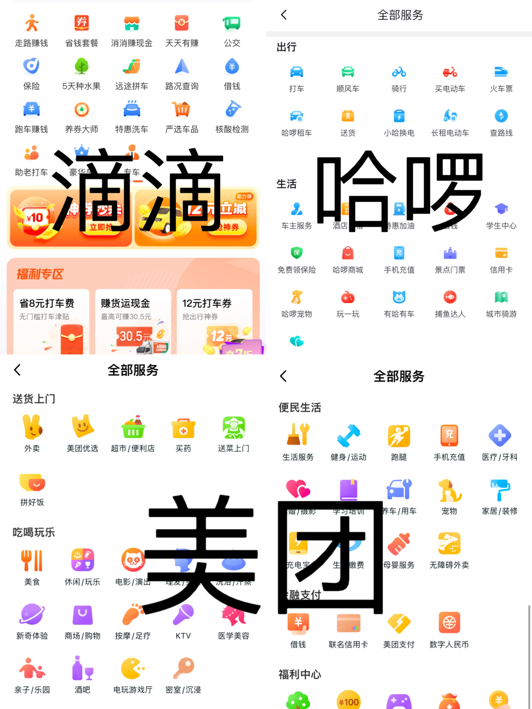 即便是增加了保险金融等服务,以及由于众所周知的原因导致用户量和活跃度均出现不小的分流,但滴滴的出行业务依旧占据主导,用户心智稳固;美团则在外卖业务基础上,广泛收割着来自吃喝玩乐、送货上门、便民生活等全方面的流量;哈啰的所有业务则主要归类为出行和生活。