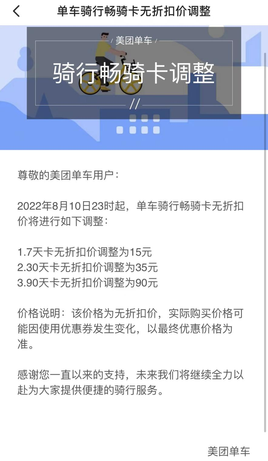 8月5日晚间,美团单车宣布将于8月10日23时起正式涨价。7天、30天、90天三档骑行卡无折扣价分别调整为15元、35元、90元。消息一出,随即再次引发大众对当下的共享单车“越来越贵、车子太少、还车太难”等众多难题的不满与吐槽,当然也包括不少在ofo平台排队等待退押金的1300万人。