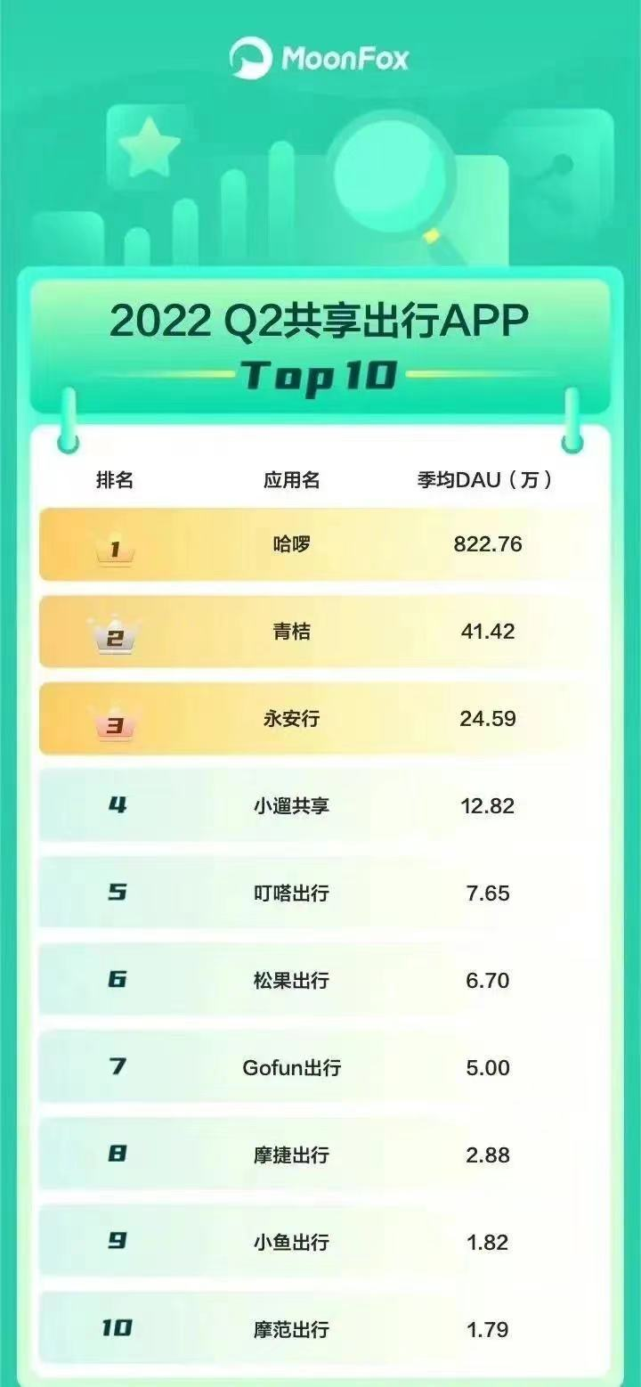 据MoonFox发布的2022Q2共享出行APP Top10榜单,哈啰单车APP季均DAU822.76万,青桔和永安行分列二三,在县城共享出行市场占据一定市场份额的松果出行位列第六,而榜单中的其他几家,对很多共享单车用户而言,可能根本连探索使用的兴趣都不复存在。