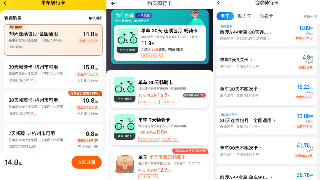 共享单车三巨头骑行套餐(截止2022年8月7日,杭州)