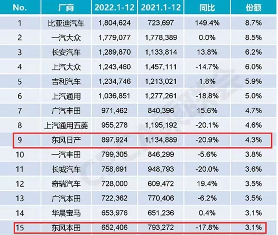 2022年的厂商销量排名中,东风日产和东风本田分别位列第9和第15。