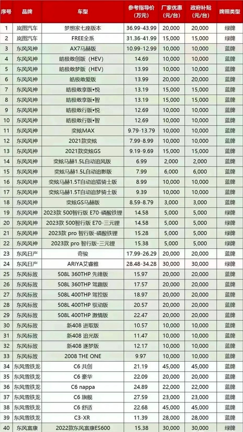 在这一政策框架下,东风汽车集团旗下包括东风本田、东风风神、东风日产、岚图、东风标致、东风雪铁龙、东风富康等7个汽车品牌、56款燃油及新能源车型,同时官宣限时促销,结合厂家让利、政府补贴等,消费者可享受4000元到9万元的优惠。