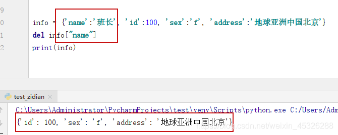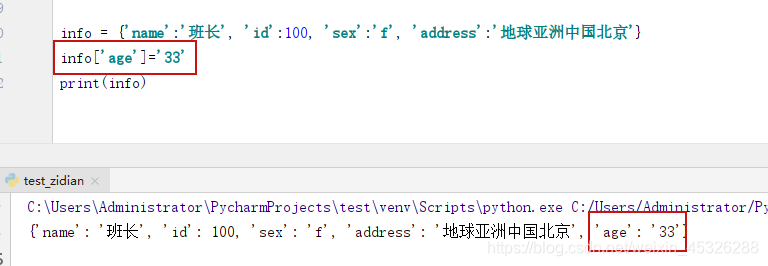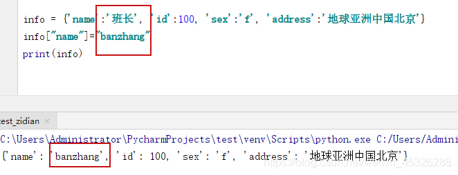 1、info = {'name':'班长', 'id':100, 'sex':'f', 'address':'地球亚洲中国北京'}