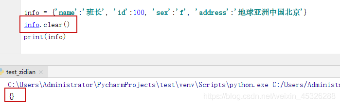 clear() 用于清空字典中所有的 key-value 对,对一个字典执行 clear() 方法之后,该字典就会变成一个空字典