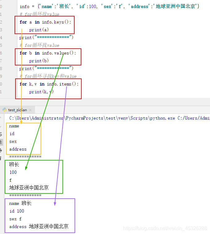 ** i.字典中找某个元素时,是根据'名字'(就是冒号:前面的那个值,例如上面代码中的'name'、'id'、'sex'、'address')**