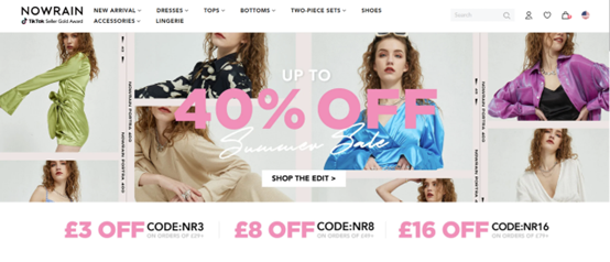 2019年,唯品会推出了快时尚出海品牌Nowrain。据了解,Nowrain目前的主营产品是时尚女装,主要用户为欧美地区的Z世代群体。在2019年,Nowrain搭建了自己的品牌独立站,从其独立站的流量来源地来看,主要是英国和美国。在成立之后两年多的时间里,Nowrain的表现一直不温不火,转变发生在今年上半年。