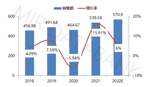 2018-2022E中国包装设备行业总体销售额(单位:亿元) (数据来源:MIR DATABANK)