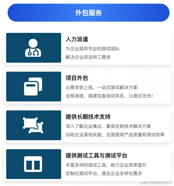 高质量的外包团队: 扎实的业务分析测试方案制定能力,扎实的业务流程分析与功能测试能力,丰富的项目实战经验,扎实的编程能力与自动化测试能力。