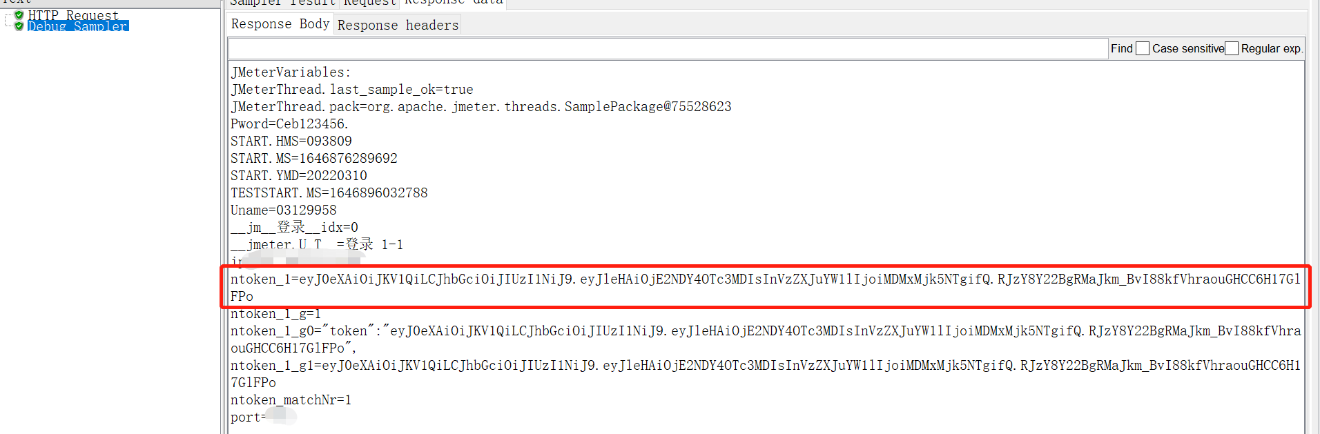 正则设置后可通过添加Debug Sampler(选中线程组右击依次点击“Add-Sampler-Debug Sampler”)验证是否截取成功并赋值给ntoken,添加后如下(默认即可):