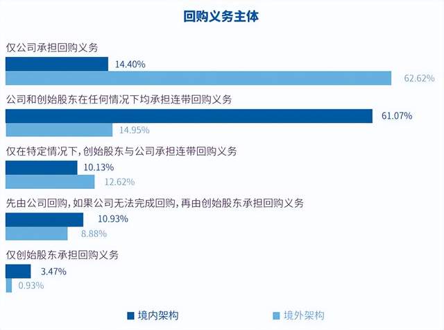 汉坤的数据亦显示,采用境外架构的VC/PE项目中,大多约定仅由公司承担回购义务,而采用境内架构的VC/PE项目中,大多约定由创始股东和公司承担连带的回购义务,还有少数项目约定仅由创始股东承担回购义务。另外值得注意的是,在境外架构的VC/PE项目中,约定仅由公司承担回购义务的项目也有所减少。