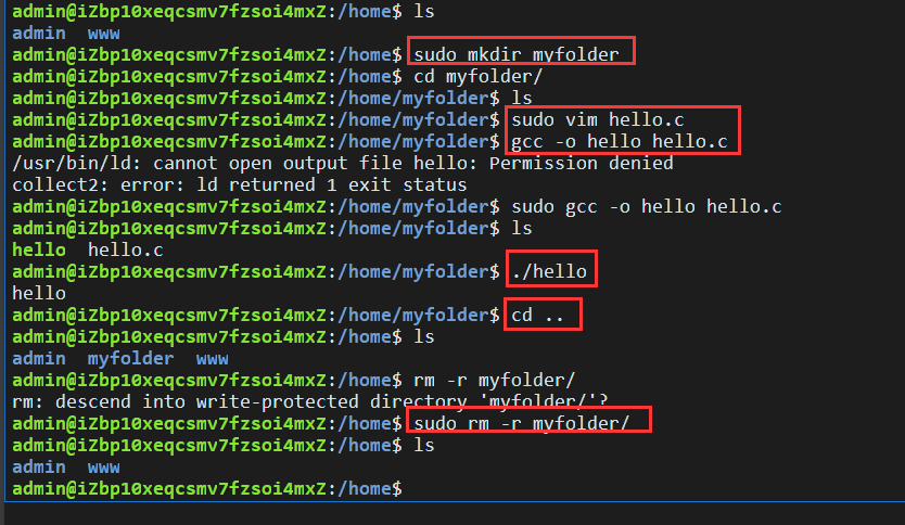 【简单示例】创建文件夹myfolder,文件夹下面创建hello.c,编译运行输出hello,最后删除文件夹myfolder