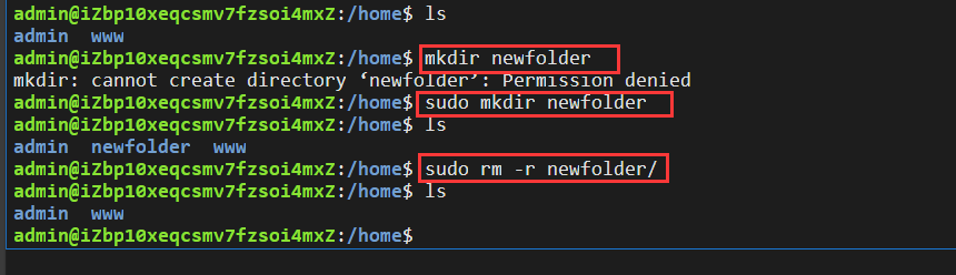 //删除名为 file.txt 的文件 rm file.txt //删除名为 my_folder 的目录及其所有内容,包括其中的文件和子目录。 //-r 参数表示递归地删除目录内容,即使目录中有其他文件或目录也一并删除。 //永久删除目录及其所有内容,无法恢复 rm -r my_folder注意:有时候可能使用mkdir或者rm等等命令显示权限不够的问题,这时普遍可以在命令前加上sudo即可。
