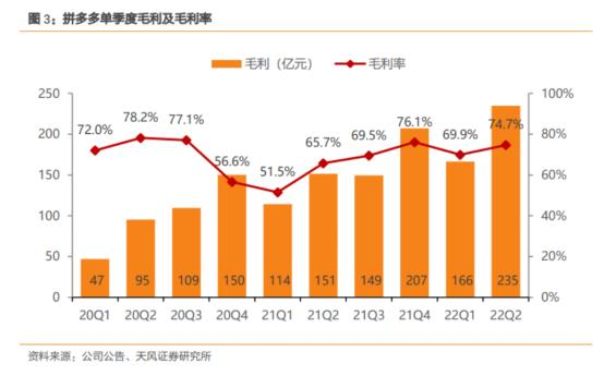作为零售类互联网大厂,拼多多的服务模式也意味着更高的成本和更低的毛利率。在减少自营商品销售规模后,毛利率也基本恢复到正常水平。本季度,拼多多实现毛利润234.78亿元,同比大增54%;毛利率为75%,较上年同期的66% 提升了9个百分点,妥妥的“印钞机”模式。