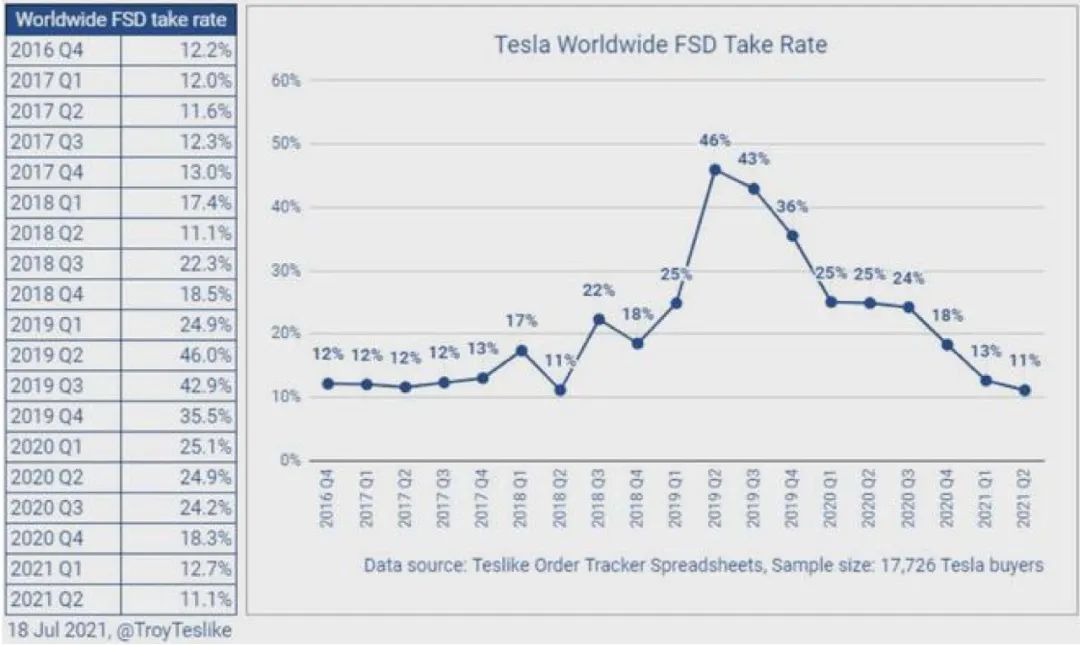 目前整个行业,都还处于低等级的自动驾驶。可以看到,同以智能化为卖点的特斯拉,2021Q2 FSD全球渗透率也仅为11%。其中,以中国和欧洲最不捧场。