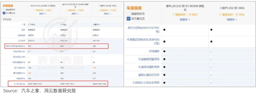 - 续航:低配小鹏P5续航里程仅450km;相同价位的比亚迪秦 plus EV 或广汽 Aion S plus,可达600km;