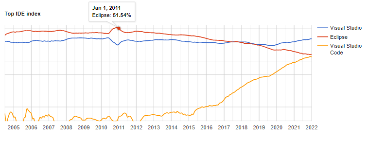 从以上数据我们可以看到自2011年1月至2022年1月,Eclipse的搜索下载频率大幅度降低,从51.54%降低至14.05%,这说明人们对于Eclipse的关注度在飞速降低。而相反的Visual Studio Code自从2015年发布以来搜索率飞速上涨。Visual Studio 也再缓慢稳步上升。