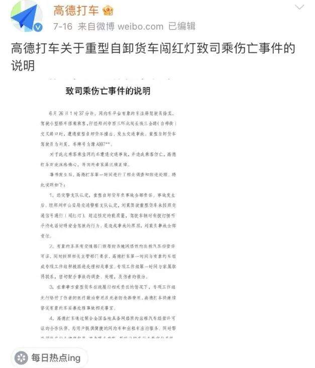 7月16日,高德打车对此事进行回应。事件经过大致是这样的,当晚有象网约车经过红绿灯路口时,遇到了边打手持电话边驾车的重型货车,货车闯红灯,并且超过了核定载质量,才酿成大祸。后面经交警支队认定,货车司机负全责,有象出行的司机不用担责。