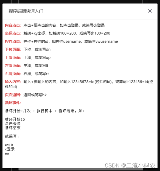 执行脚本的时候,大家可以看到都是通过中文或简写进行编辑的,其实这些都是我们自己所定义的,也就说,我们可以随意定义,比如点击登录,最重要的是登录两个字,你点击也好,click也好,根据定义的这个,回到我们的程序中,进行截取,触发相关的逻辑即可,下面的图是我自己定义的。