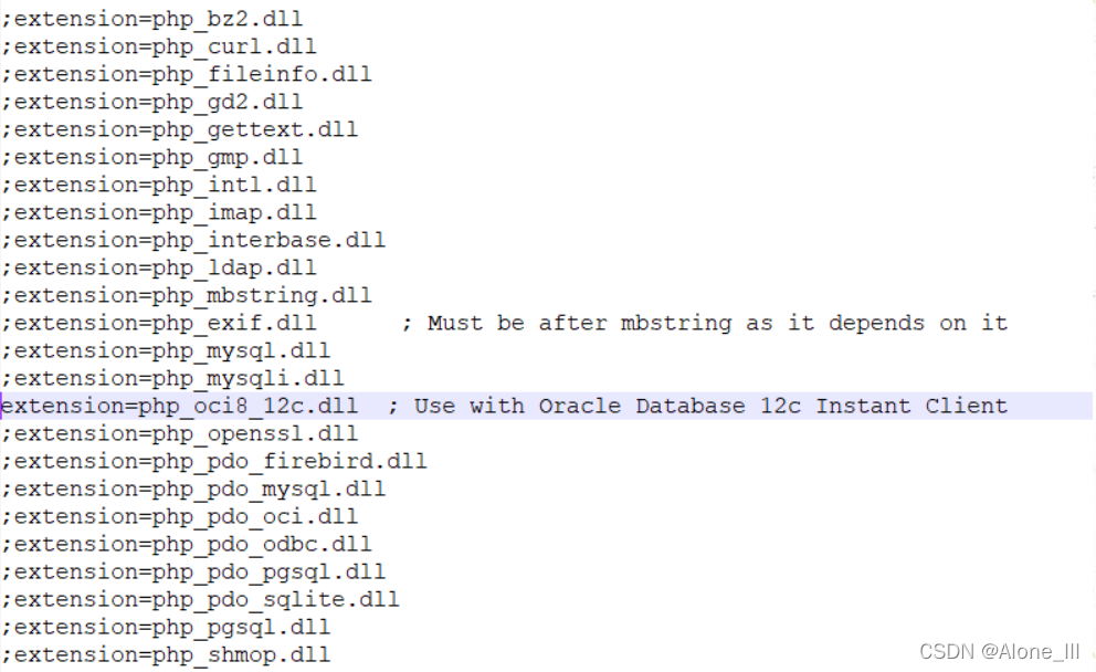 - 搜索“oci8”——此处为注释开启的扩展部分,有需要可以打开注释 - 普通安装只需打开php_oci8_12c.dll(需要对应ext目录下的文件、注意版本)
