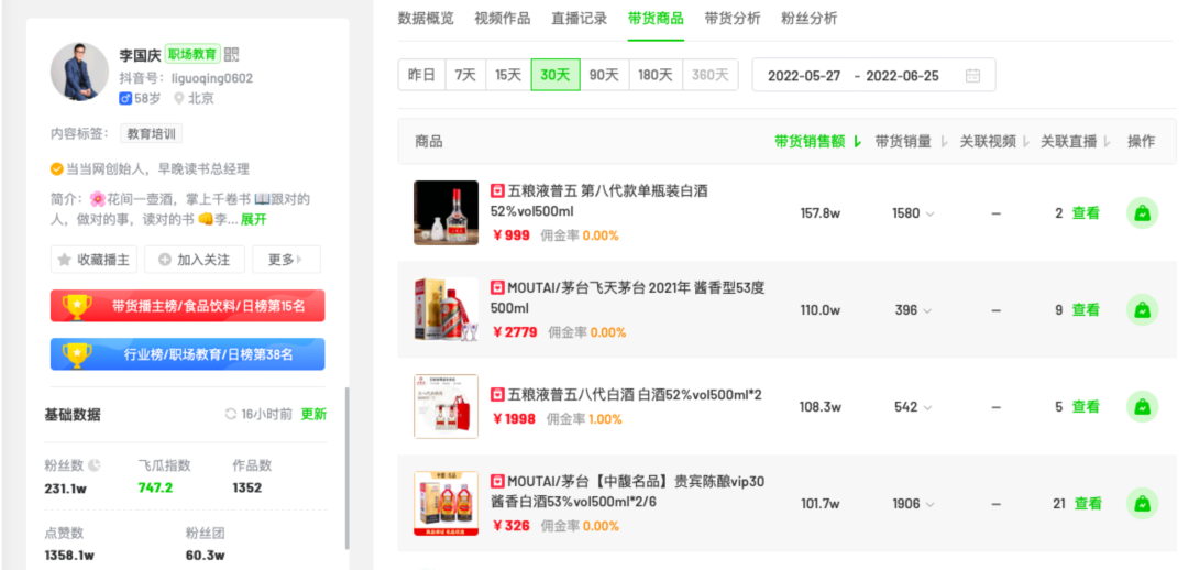 根据飞瓜数据显示,这两场直播总和在160万左右。甚至还没有快手酒水主播李宣卓6月14日一场的GMV(约660万)高。但值得注意的是,李国庆已经是今年成长起来的酒水垂类主播之一。