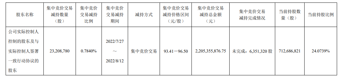 今年6月,彼时药明康德公布的减持计划显示,这21家股东计划集中竞价交易减持不超过2956.01万股,大宗交易减持不超过5912.02万股,今年9月底实施完毕。最终减持结果显示,减持股东于2022年7月27日至2022年8月12日通过集中竞价交易方式累计减持2320.878万股公司A股股份,占总股本的0.784%,平均成交价格为95.02元/股,通过集中竞价交易合计套现金额为22.05亿元。
