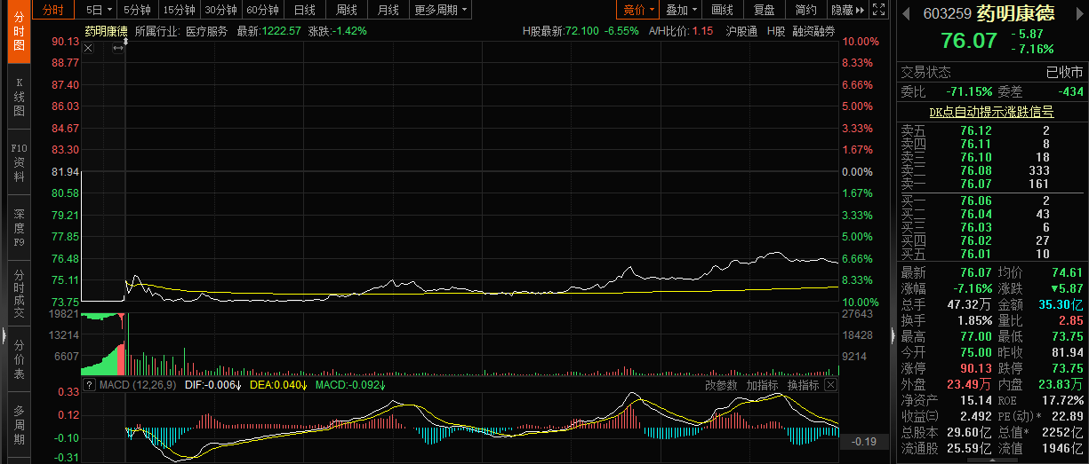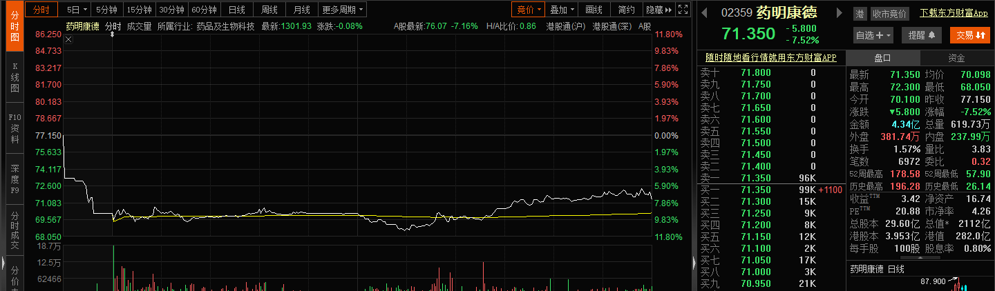 交易行情显示,11月28日,药明康德开盘低开8.47%,开盘后交易十几分钟后,药明康德触及跌停。在多方博弈下,药明康德打开跌停板。临近尾盘,药明康德股价窄幅收窄,但仍收跌7.16%,收76.07元/股。