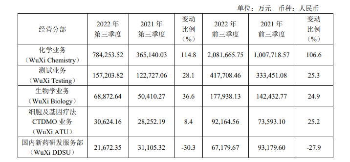 钛媒体APP注意到,药明康德的股价与业绩严重分化。今年前三季度,药明康德实现营业收入283.95亿元,同比增长71.87%;归母净利润73.78亿元,同比增长107.12%。分业务来看,化学业务、测试业务、生物学业务、细胞及基因疗法CTDMO业务、国内新药研发服务部分别实现营收208.17亿元、41.78亿元、17.79亿元、9.22亿元和6.72亿元,分别实现增长106.6%、25.3%、24.9%、25.2%、-27.9%。