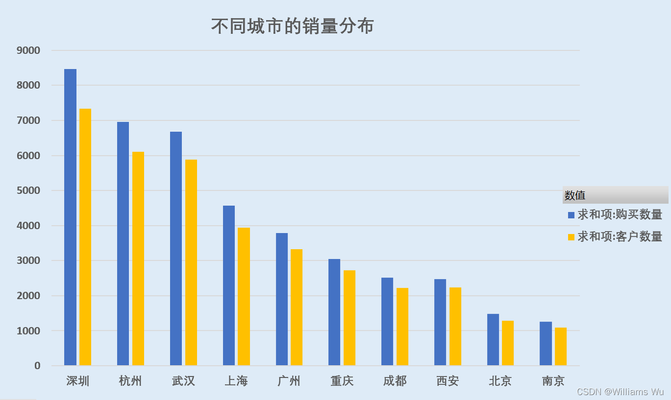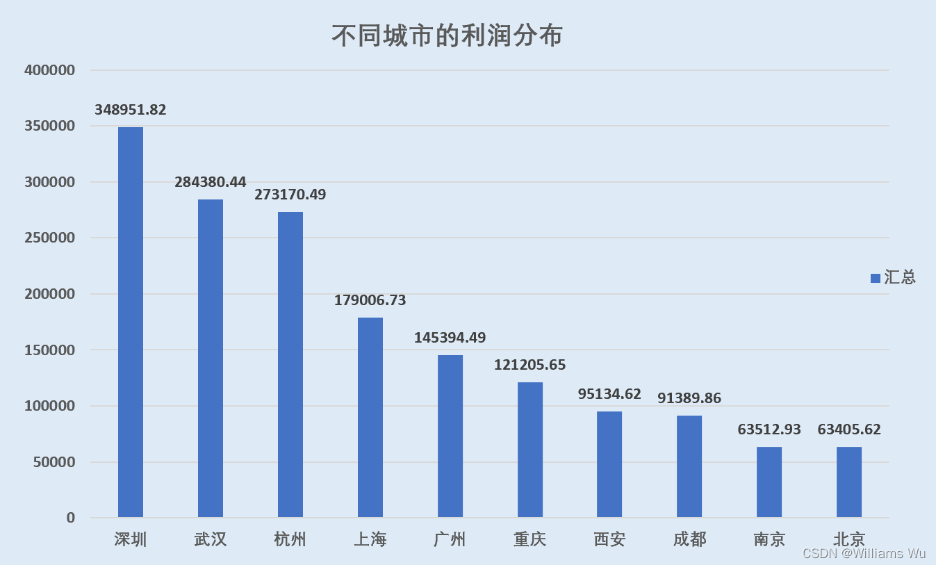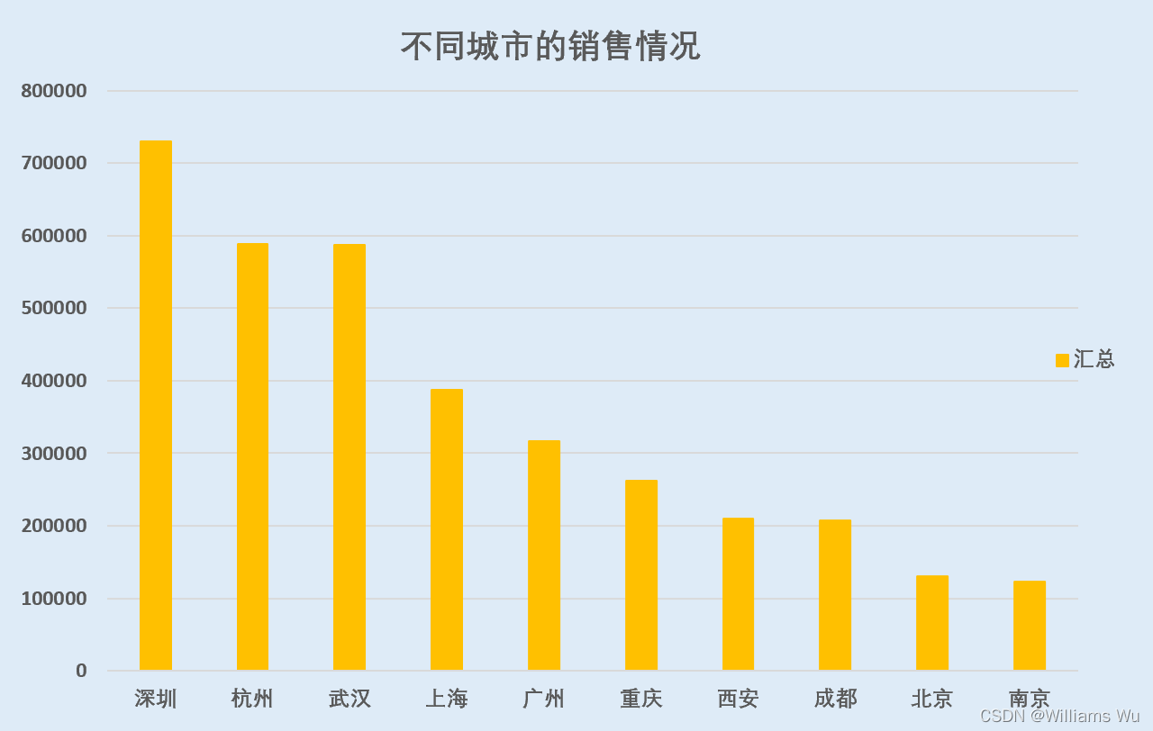 ** >>>**从不同城市的销售额分布来看,销售额排名前三的城市有深圳、杭州、武汉,都达到50万以上的销售额,其中深圳达到了70万以上的销售额,其他城市的销售额均在40万以下。其中西安、成都和北京及南京等城市的销售额较低,均在在22万以下。