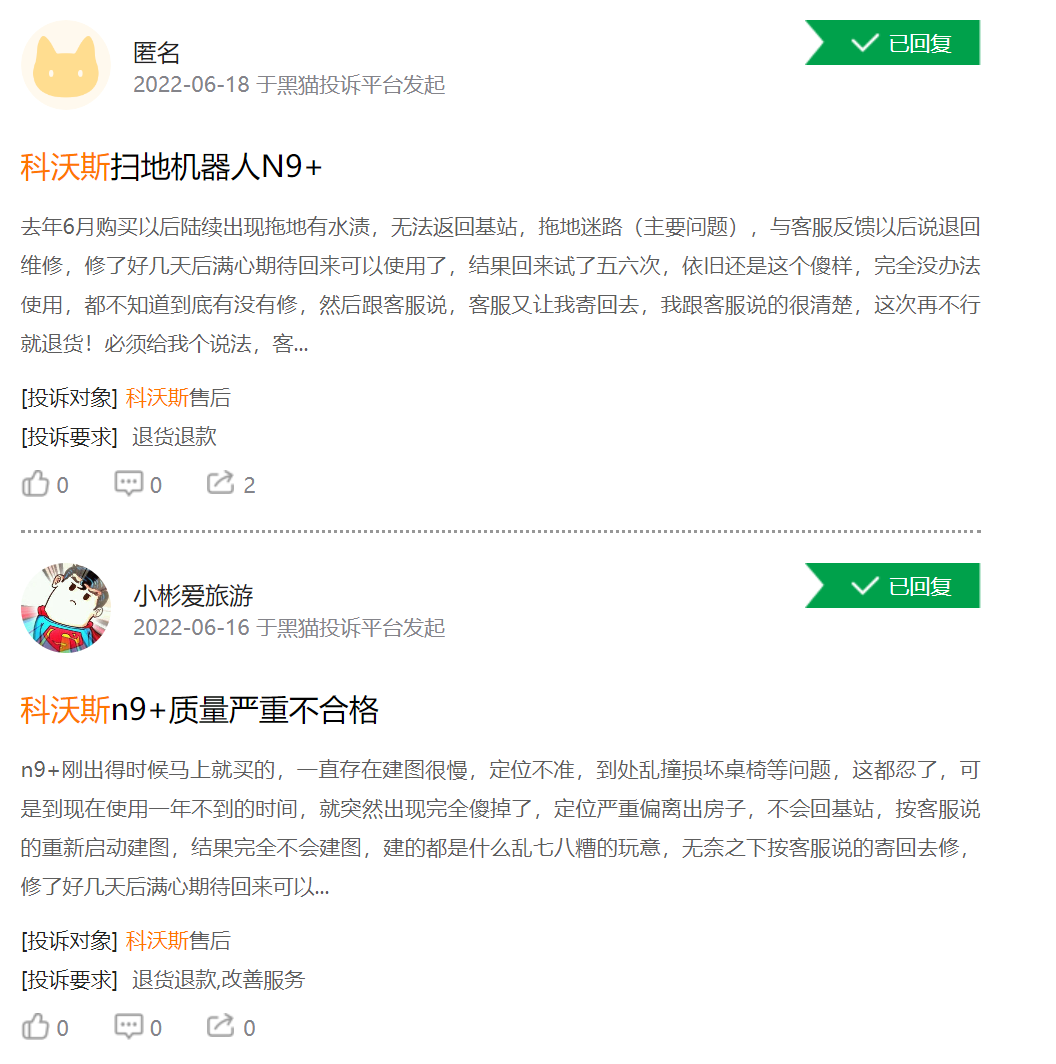 其中,科沃斯的主力产品N9+扫地机器人就收到了多个差评。多个用户都投诉该产品出现定位不准、无法返回基站等问题,且售后服务质量也不能令人满意。