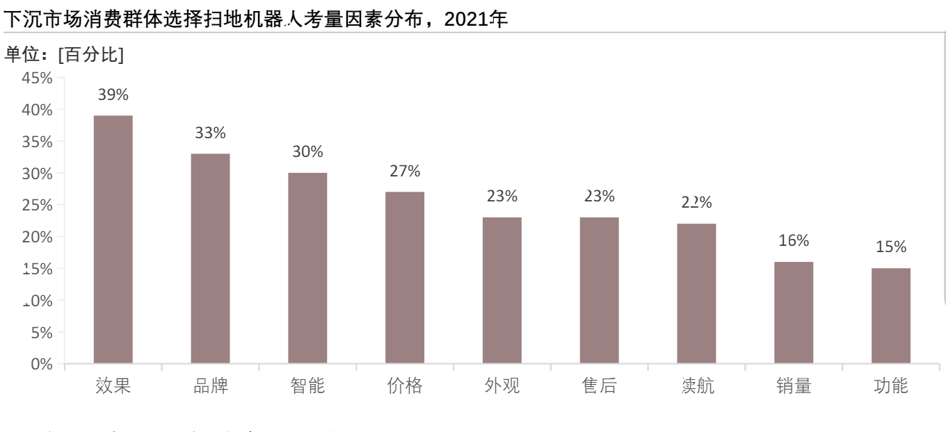 根据这一项最新调查,消费者在选购扫地机器人时优先考虑的三大因素是效果、品牌和智能,随后才是价格和外观。甚至在传统印象中更重视性价比的下沉市场,也有大量用户认为效果比价格更重要。