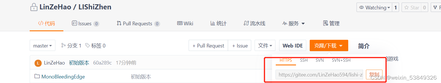 在上传文件之前需要获取到远程仓库链接,复制该链接后续有用