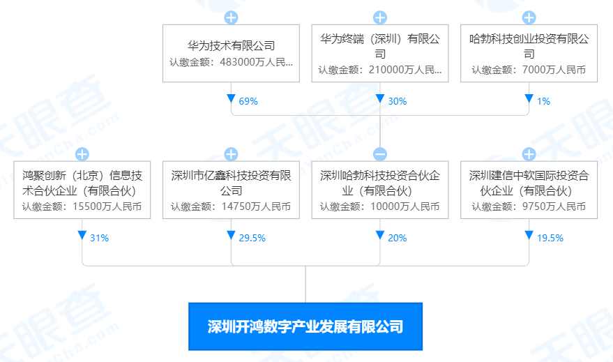 通过股权穿透可以发现,深开鸿的两大股东分别为哈勃投资和中软投资,持股比例分别为20%和19.5%。其中哈勃投资由华为全资控股,中软国际早在2015年就引入华为作为战略股东,并且华为还是中软国际的首要客户。