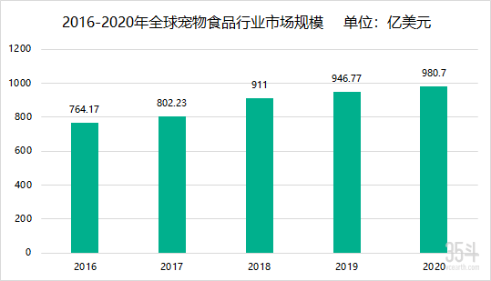 图1:2016-2020年全球宠物食品行业市场规模 单位:亿美元,数据来源:Euromonitor,35斗制图