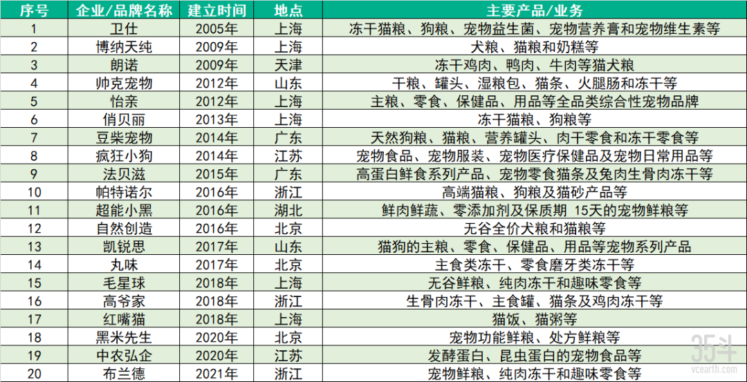 表2:我国部分从事宠物食品的企业(按企业成立时间排序)信息来源:公开信息,35斗绘制