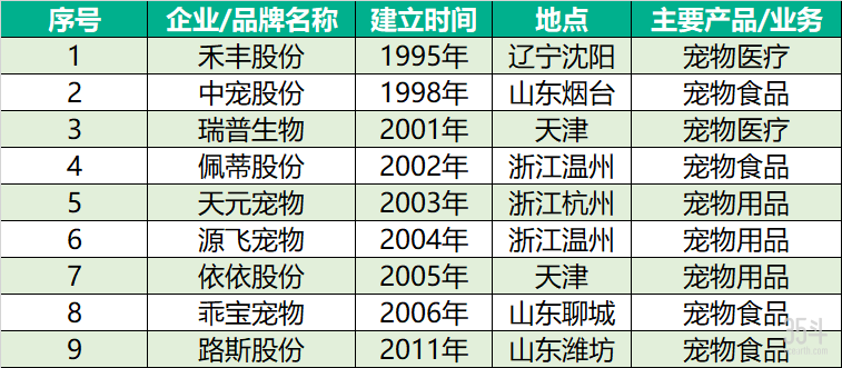 表1:A股宠物上市/IPO公司汇总(按企业成立时间排序) 信息来源:公开信息,35斗绘制