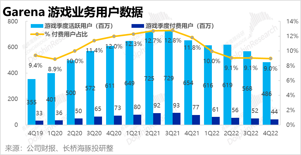 首先用户数据上,Garena 的季度活跃用户数量再度环比减少了超 8000 万人,实际贡献收入的付费玩家数,也环比减了约 800 万。用户流失情况越发严重,付费率也继续下滑。(但和市场预期一致)