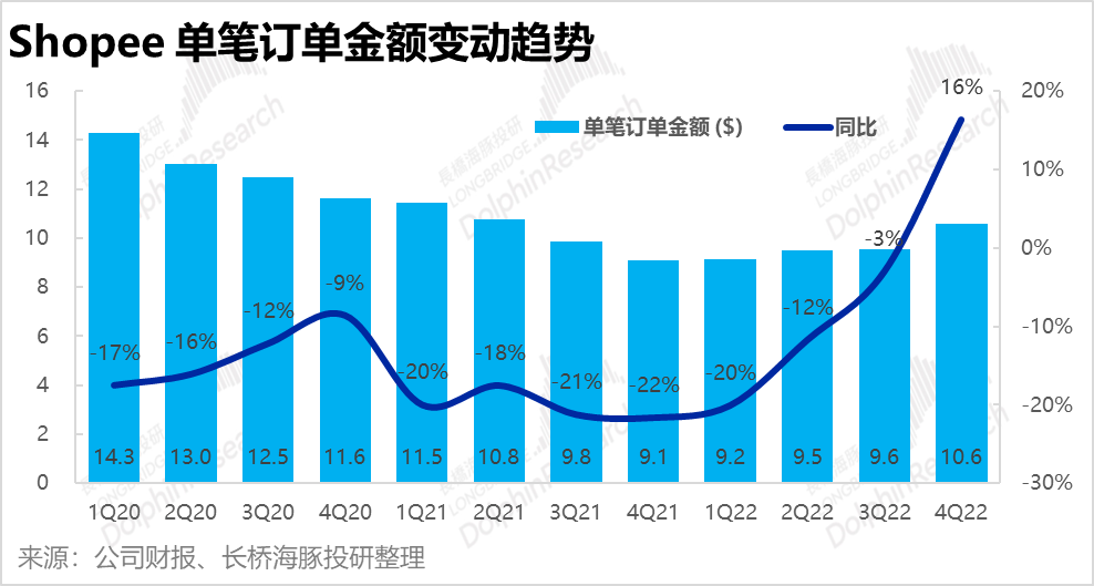 价的角度,在逐步向核心市场收缩后(东南亚和巴西),Shopee 整体的客单价在持续回升,本季达到 10.6 美元,同比止跌转增 16%。海豚君认为如此巨大的客单价提升已不是市场提纯能解释的,公司应当大幅减少了对商品的价格补贴。而补贴减少也自然会导致用户下单的减少。