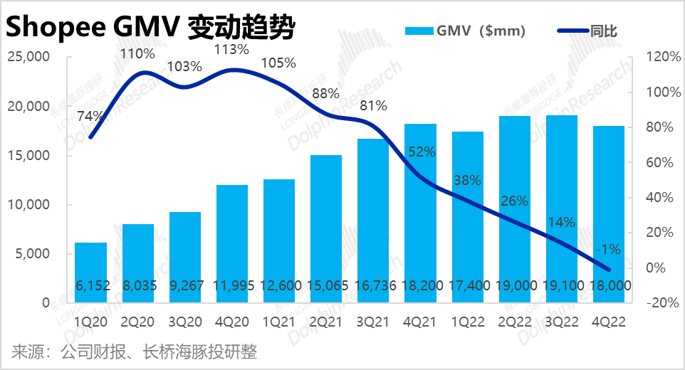 反映到财务数据上,**本季度 Shopee 的 GMV 为 180 亿美元,同比转跌 1%**,环比上季度 191 亿也显著下降。步游戏板块的后尘,Shopee 的增长从放缓变成了萎缩。
