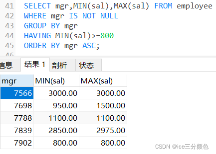 例:查询各个管理者手下员工的最低工资和最高工资,按照管理者编号由小到大排序,没有管理者的员工不计算在内。