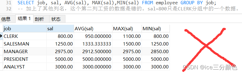 1.SELECT子句中只允许出现与GROUP BY子句中相同的分组字段和分组函数(使用了聚合函数的),也就是说不能再跟除了group by之后的列名之外的其他列名了,不然会出错(不会报错,但跟的其他列名下的数据是错误的)。