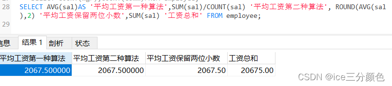 SELECT AVG(sal)AS '平均工资第一种算法',SUM(sal)/COUNT(sal) '平均工资第二种算法', ROUND(AVG(sal),2) '平均工资保留两位小数',SUM(sal) '工资总和' FROM employee;