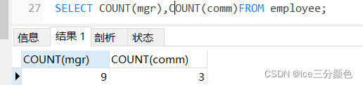 查询公司里有多少员工是由经理管理的、多少员工是有奖金的(COUNT(列)函数不对NULL值进行统计,所以统计结果mgr非空值有九行,comm非空值有3行)