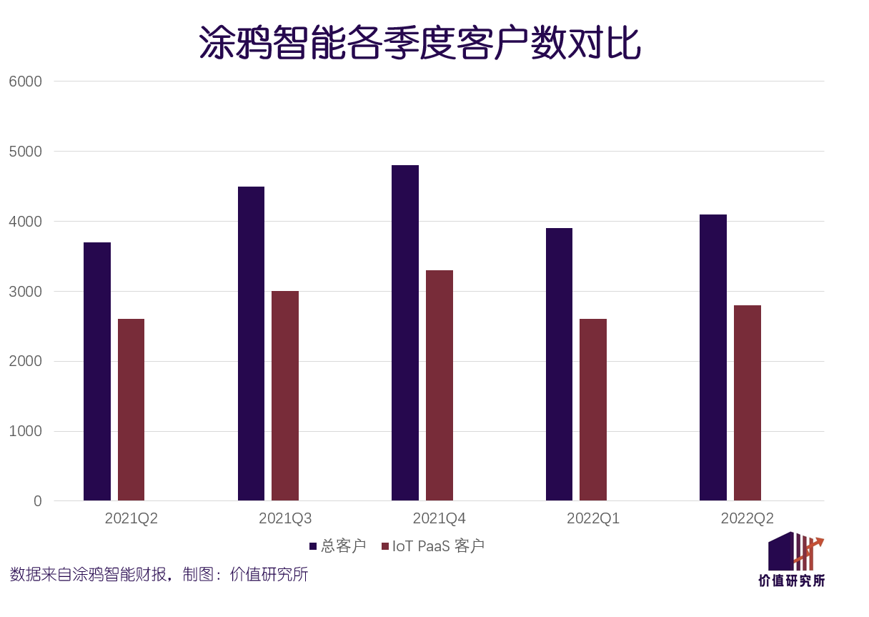 数据显示,截止今年二季度末,涂鸦智能客户总数约为4100家,较去年同期仅增加约400家,较今年一季度增加约200家。其中,二季度的IoT PaaS客户数为2800家,同比仅增长约200家。更糟糕的是,这两项数据均较去年四季度的峰值明显下滑。数据显示,去年四季度涂鸦智能客户总数和IoT PaaS客户数分别为4800家和3300家。