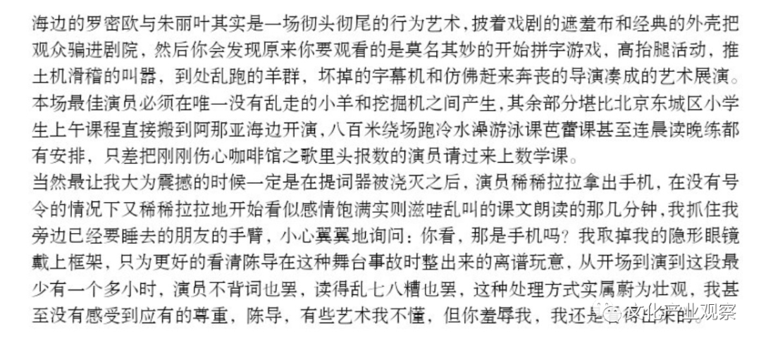 这些糟糕的剧评都指向了一处——“海边”。这是阿那亚戏剧节的主题,也是其最重要的创意所在,但这是否只是一个宣传的噱头呢?实际上它的剧目并没有驾驭这种独特演出形式的能力,没有形式与内容的结合,只是把一些新奇、多元而又破碎的元素直接搬到沙滩上塞给观众。在新鲜感过去之后,观众很快就会觉得厌烦。