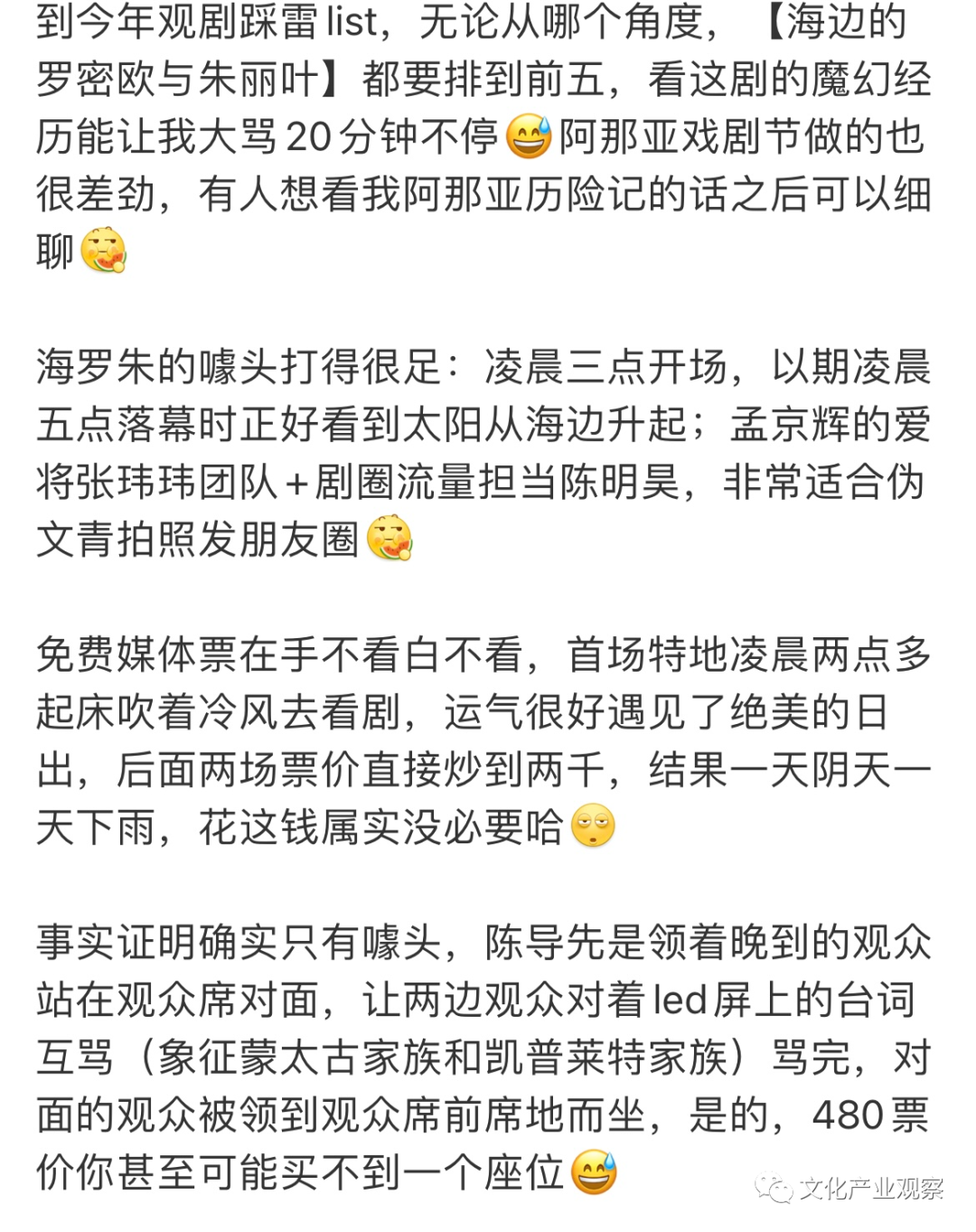 高价,又是随之而来的第二个问题。阿那亚的重磅剧目,票价最低档基本都在400以上,而其中被炒得最热的正是《海边的罗密欧与朱丽叶》,黄牛票票价一度突破了4000。一分钱一分货,高价格也对应着消费者的高期望,如果拿不出真正上乘的作品,那么高价票注定只能昙花一现。