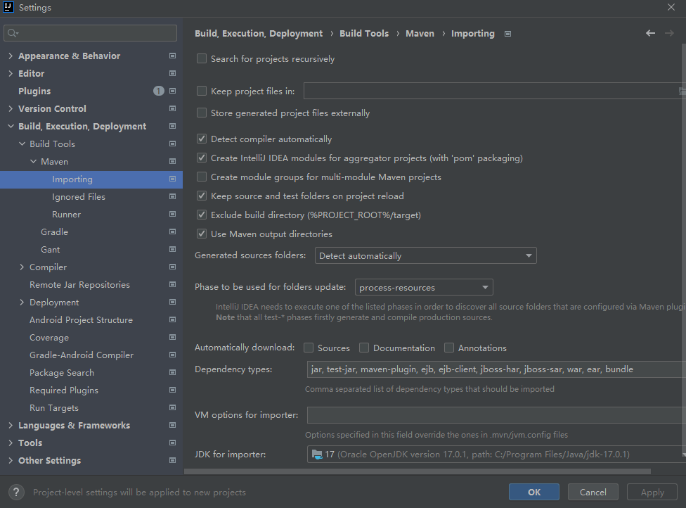 配置创建新项目mevn的使用,打开idea File->New Projetcs Setup->Settings for new Projetcs...->Build,Execution,Deployment->Build Tools->Maven。修改importing中的JDK for imorter: