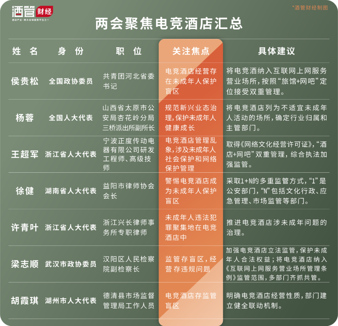 《酒管财经》梳理总结,大部分代表委员认为电竞酒店的管理乱象,对于保护未成年人的合法权益带来很大压力。