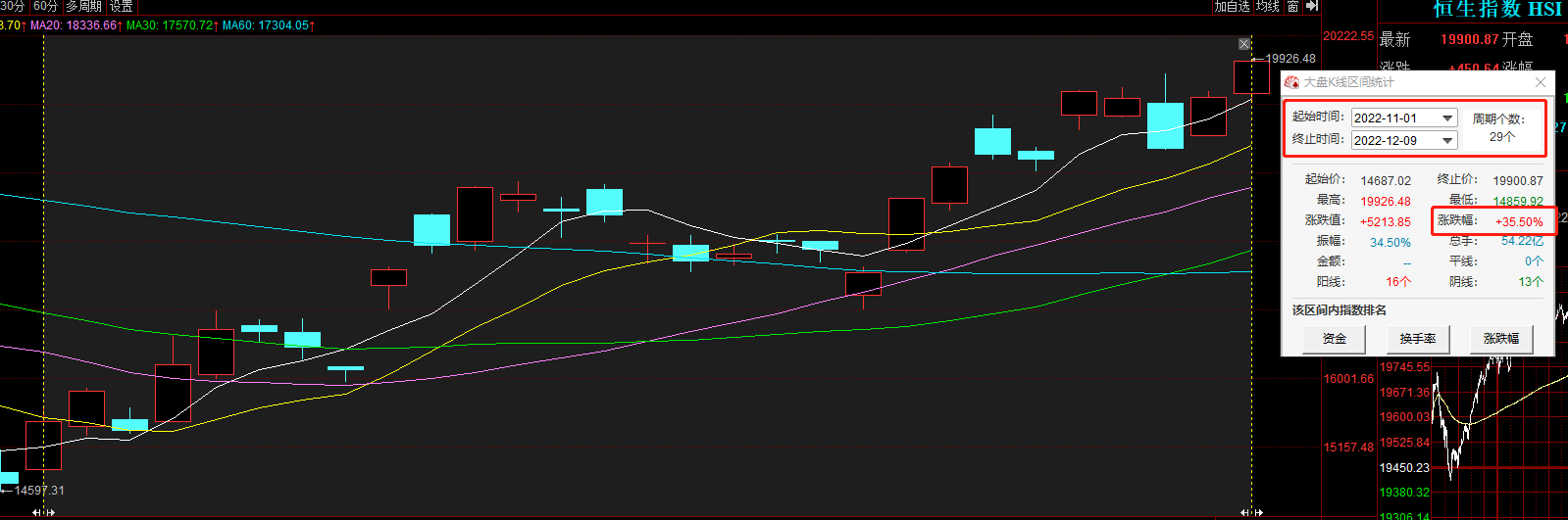 12月9日,经历29个交易日的强势反弹后,恒生指数再次来到了20000点大关前,一个月时间累计上涨超35%。